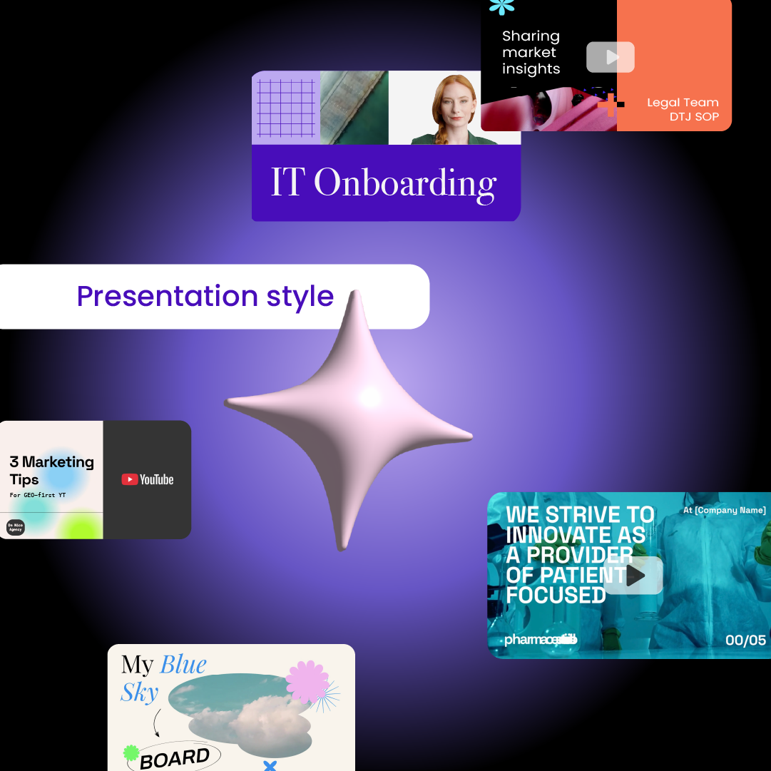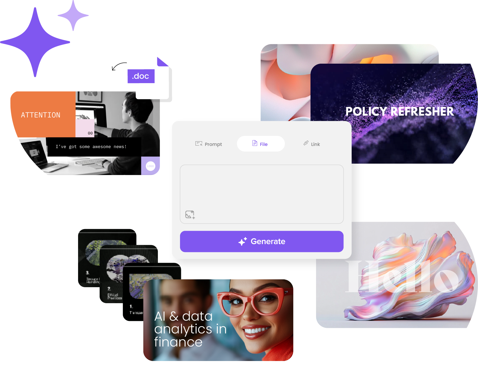 Convert source content into dynamic, pre-branded presentations with motion and narration. Present live, export as video, or download as a PDF without duplicating work. Add an AI avatar, apply brand kits in one click, and edit every slide before you share.