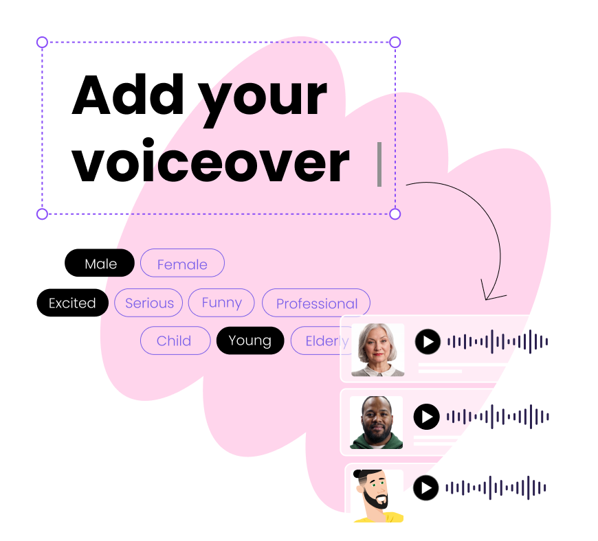 Bring your characters and to life with Powtoon's full AI suite - text-to-speech, auto-captions, lifelike avatars, AI-generated audio, and more. Transform static characters into dynamic presenters and brand spokespeople.